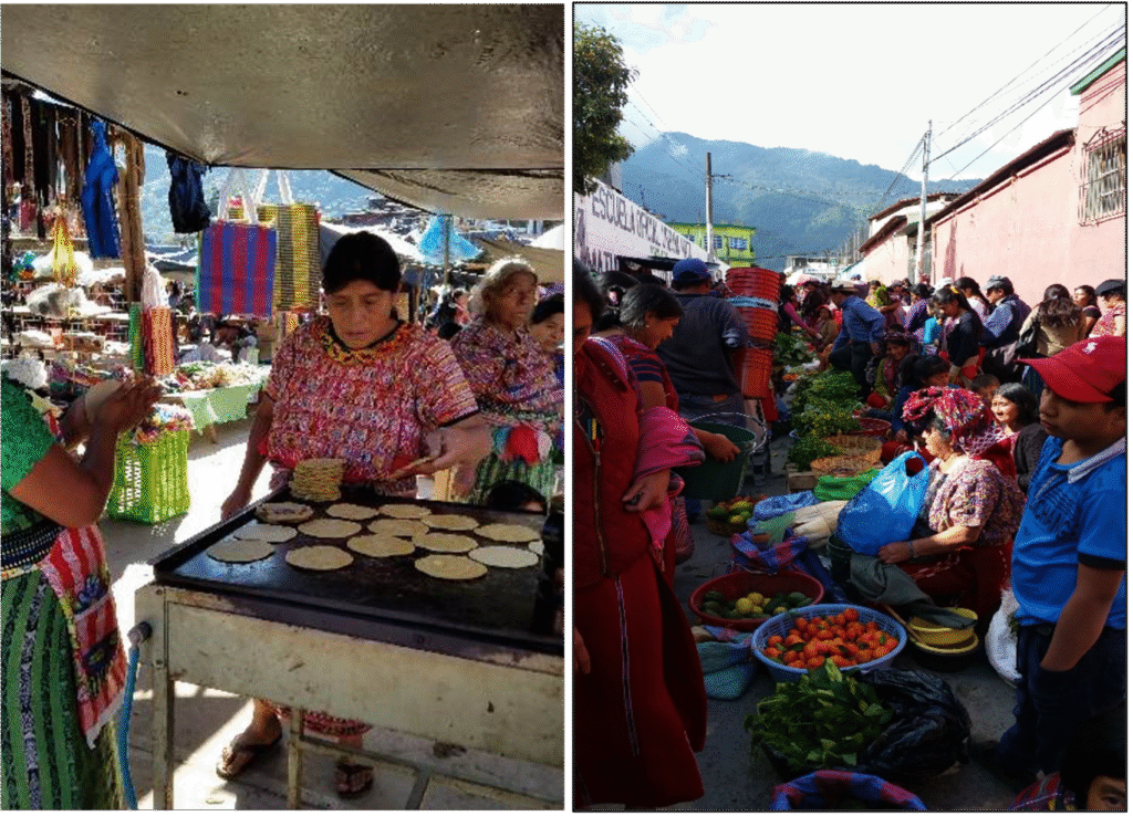 The Nebaj Mercado Campesino—thefirst and largest of several ‘peasant markets’ in the Ixil territory—is located just off Nebaj municipality’s central plaza in the Quiché department of Iximulew, or Guatemala, a predominantly Indigenous Maya region rich in biocultural diversity (Myers et al., 2000). In an otherwise verdant landscape of green on green, each market erupts in a flurry of bright colors. The bright red of the Maya Ixil women’s long traditional skirts and the vibrant colors of their traditional woven huipil blouses seem to allude to the diversity of color from the foods harvested from the land. Here, campesinxs offer raw fruits, vegetables, tubers, flowers, chickens, and seeds, while the smells of prepared and ready-to-eat foods, such as cooked malanga, boxbol[1], and various prepared maize bites, lure in hungry passersby (Figure 1). Ixil artisans offer woven clothing, baskets, pottery, soaps, and body care products—embodying knowledge, time, and workmanship. As biocultural hubs of the highland Mesoamerican food systems, referred to as ‘milpa‘, these markets are vital more-than-human gathering points in landscapes long stewarded by Maya peoples.