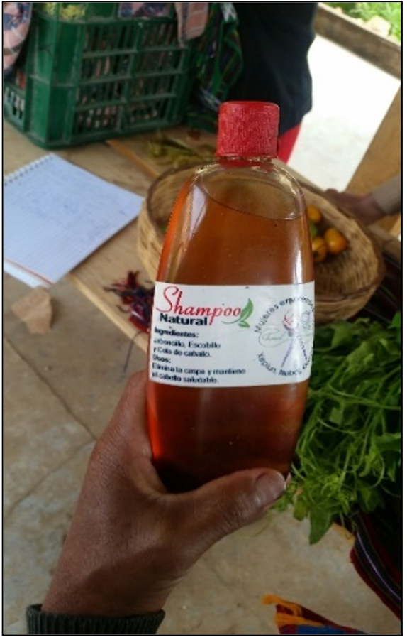 Meeting campesinxs directly at their milpas, the Escuela enables participants like Doña Reza to take part in this”school outside of school” as adult learners from their own villages. They co-create the curriculum based on local needs and discover, among neighbors and fellow campesinxs, what skills and knowledge exist within each learning group that can be mobilized for common benefit. A member of Nebaj Mercado‘s Junta Directiva[35], Doña Reza explained that she learned to create medicinal plant products—now her specialty at the Mercado—through workshops and market-tangential events in her territory. Pointing to bottles of her handmade shampoo (Figure 7), she told me at one Nebaj Mercado how she learned to make these local plant-based products from other women’s workshops in her community.